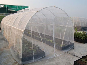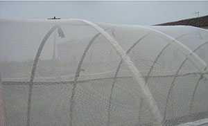 (2)以竹片或钢筋弯成小拱架,插于大田畦面,将防虫网覆于拱架上,以后浇水直接浇在网上,一直到采收都不揭网,实行全封闭覆盖。